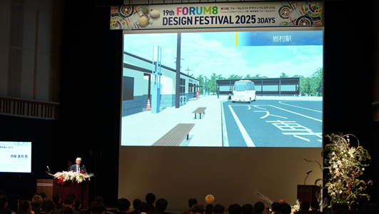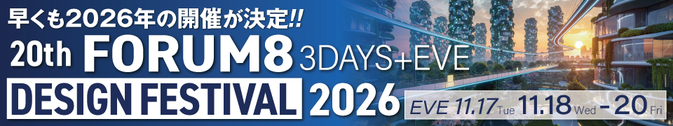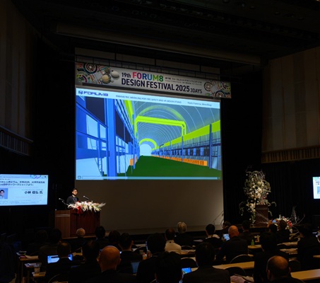 All about FORUM8 Products. 19th FORUM8 DESIGN FESTIVAL 2025 3DAYS+EVE 11.19WED-11.21FRI EVE11.18TUE 品川インターシティホール・ホワイエ 開催レポート
