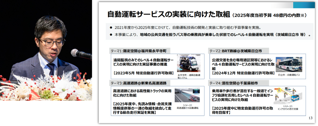同カンファランス5番目は、家邉健吾・国土交通省物流・自動車局技術・環境政策課自動運転戦略室 室長が「自動運転の実現に向けた取組について」と題し特別講演。自動運転が求められた背景、自動運転の実現に向け自家用車と((ルートや地域が限定されがちな)商用車で異なる2つのアプローチを概説。次いで、自動運転サービスの推進における国交省の支援策を制度整備と事業化推進の2面に分類。前者に関しては警察庁と連携し2020年4月に道路運送車両法と道路交通法の改正によりL3自動運転が、2023年4月に道路交通法改正と道路運送車両法の安全基準策定によりL4自動運転がそれぞれ制度上可能になった流れ、L4自動運転車の公道走行のための手続きを説明。後者に関しては2025年度自動運転社会実装推進事業として地方自治体への初期投資の補助事業(67件)の概要と実装事例を紹介。これらを受けた自動運転移動サービス実装の現状と浮かび上がった制約、同サービスの普及・拡大に向けた、1)多様な走行環境に対応可能な車両導入、2)L4自動運転の複数車両を一人で遠隔監視、3)面的に走行する自動運転タクシー―などへの今後の重点支援に言及。一方、技術的な支援策として「レベル4モビリティ・地域コミッティ」の設置、経産省・警察庁と連携した「自動運転移動サービス社会実装・事業化の手引き」作成にも触れます。
