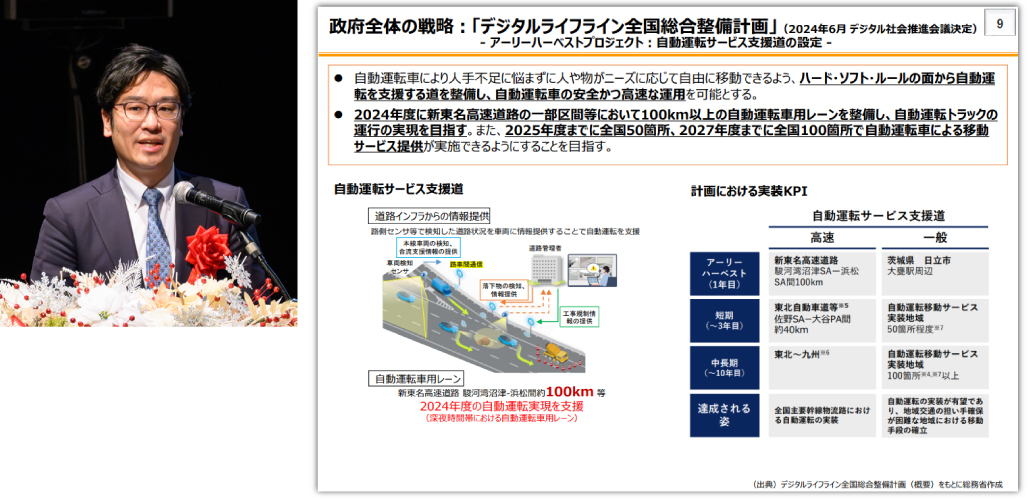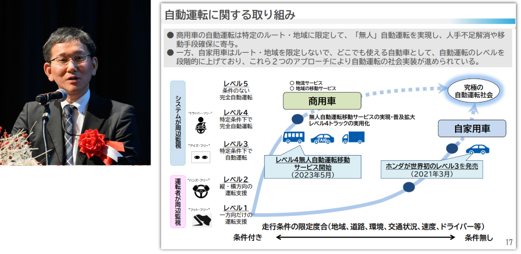 午後の部最初の特別講演は、竹下正一・国土交通省道路局道路交通管理課高度道路交通システム(ITS)推進室 室長による「自動運転に関する国土交通省道路局の取組について」。ITSの導入目的や概念、自動運転の進化がもたらす新たな道路空間とモビリティの創造を図解。物流や地域公共交通を巡る課題、その対策としてレベル4(L4)無人自動運転移動サービス(2027年度までに100カ所以上)とL4自動運転トラック(2025年度以降実現)に向けた政府目標を提示。L4自動運転向け許認可、自動運転技術を活用したまちづくり計画向け支援、自動運行補助施設の設置工事に係る資金貸付金といった施策も列挙。その上で、わが国におけるL4自動運転の現状(L4の許認可取得8カ所)、自動運転タクシーおよび自動運転トラックの現状、自動運転車両の開発動向から、環境に応じた自動運転とインフラ連携の方向性へと話を展開。道路局が取り組む新東名高速道路における自動運転トラック実証実験(L4自動運転トラックの実現に向け合流支援情報や先読み情報の提供等)、これまでの自動運転による移動サービス(L4第1号の永平寺町)、一般道の自動運転移動サービスに求められるインフラ支援、路車協調システムの有効性(安全性)、走行空間の整備例などを紹介。自動運転インフラ検討会の概要、自動運転×インフラ連携のスケジュール案にも触れます。