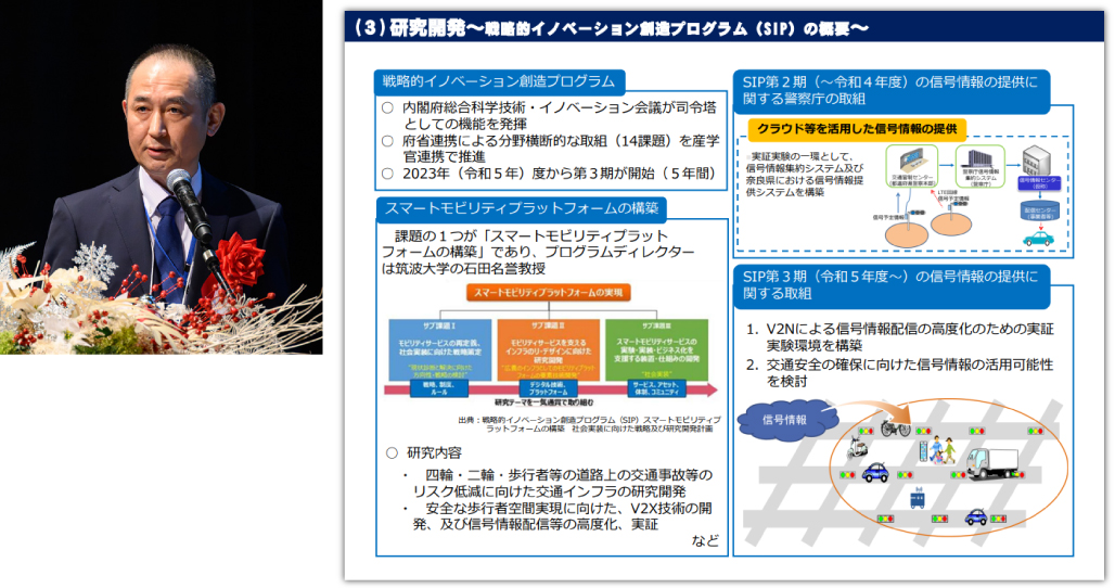 同カンファランス最後の特別講演は、成富則宏・警察庁交通局交通企画課自動運転企画室 室長による「自動運転の実現に向けた警察の取組について」。自動運転に期待される効果、その実現に向けた政府目標、自動運転サービス支援道とその取組事例を解説。その後、自動運転実用化の進展を支援する同庁の取組を整理。まず交通ルールの整備では1)L3自動運転(運転者の存在を前提)の実用化に伴う制度整備(道路交通法:2020年4月施行)、2)L4自動運転(一定条件下で運転者不要)の実用化に向けた制度整備(同上:2023年4月施行)、3)「2」で触れた特定自動運行許可制度に基づく手続きと特定自動運行実施者・同主任者の義務、4)上記の事例として茨城県日立市における特定自動運行(L4)の概要を説明。また公道実証実験環境の整備として「自動走行システムに関する公道実証実験のためのガイドライン」「自動運転の公道実証実験に係る道路使用許可基準」「信号制御機等に接続する無線装置の開発のための実験に関する申請要領」を列挙。さらに自動運転システムの実用化に向けた研究開発として「戦略的イノベーション創造プログラム(SIP)」の概要、SIP第2期(~2022年度)およびSIP第3期(2023年度~)での信号情報の提供に関する取組へと展開。システム機能の過信・誤用防止に向け動画等を用いた広報・啓発にも言及しました。