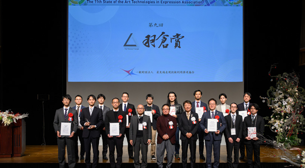 冒頭の長谷川章・最先端表現技術利用推進協会(表技協)会長による挨拶に続いて、第9回羽倉賞の表彰式が行われ、羽倉賞、2つの企業賞(フォーラムエイト賞)、2つの優秀賞、4つの奨励賞が発表されました。今回羽倉賞を受賞したのは、NHK放送技術研究所の「触覚と香りで体感する3次元コンテンツ~体感!昭和100年商店街砧ラボと一緒におでかけリポート~」。体験者が登場人物と感覚を共有することで、言語に加えて直感的に情報や感情を伝えることができるものです。審査委員の佐藤誠・東京工業大学名誉教授は、かき氷を削る感覚や冷たさ、香りを通して、昭和の情景が鮮やかによみがえることに触れ、「五感を用いた新しい放送体験の可能性を探求しており、未来に向けた大きな一歩」とコメントしました。