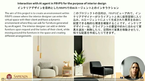 F8VPS内でAIと連携したインテリアデザインツールを開発。家具などの3Dモデル生成と配置をAIが支援し、ユーザはプロンプト入力だけで多様なデザイン検証が行える仕組みを提案しています。