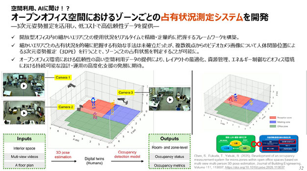 解体建物の部材をデータベース化し、再利用部材で新しい建物を設計する研究を紹介。従来手作業だった部材選定をAIと3Dソフトで自動化できるかを検討し、持続可能な建築の実現を目指しています。