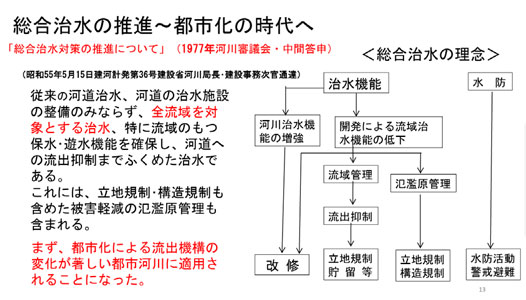 まず、浸水氾濫モデルの概念に触れた後、1950~2000年代を4つの世代に分けて流出・浸水プロセスのモデル化の変遷を整理。戦後、ピーク流量に加え確率やハイドログラフの算出が求められた「前コンピュータ世代」の3モデル(応答関数型モデル、概念モデル、雨水流モデル)、都市化を受けた総合治水の推進、土地利用の変化を評価する「準線形貯留型モデル」(1977年)に次いで、1980年代以降大型PCの利用拡大とともに都市域の流出解析モデルの主流となる「物理モデル」の概念、同時期に守田研究室で開発した浸水氾濫モデルへと話を展開。さらに「パッケージ・ソフトウェア世代」の2000年代以降はPCの能力向上と市販ソフトの普及が進展。東海豪雨(2000年)を機に注目されたハザードマップの、情報公開法(2001年施行)や水防法の改正(2001年)、その後の宅地建物取引業法施行規則の一部改正(2020年)を受けた作成ニーズの高まり、2005年の国際雨水排除会議(ICUD)で発表されたxpswmm、2000年代以降に欧米で開発が進んだ都市流域を対象とする浸水氾濫解析や下水道水理解析の各種ソフト、豪雨期に雨水で菅水路が満管状態となりマンホールから水が噴き出し内水氾濫を引き起こす現象を簡易に計算する「プライスマン・スロット」に言及しました。