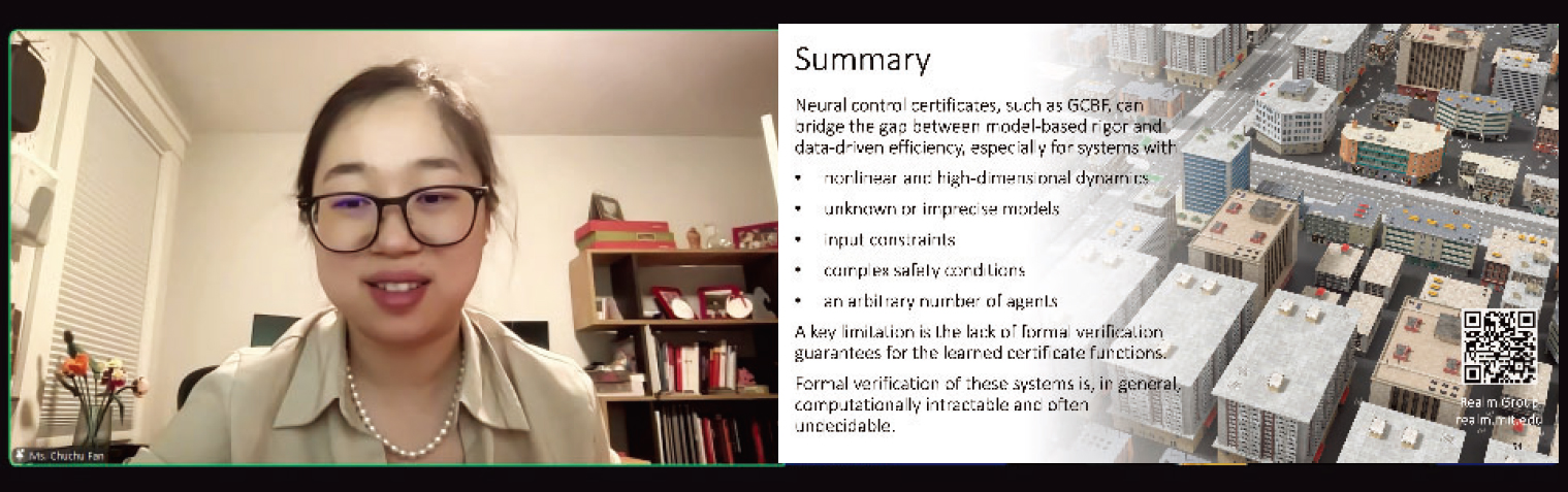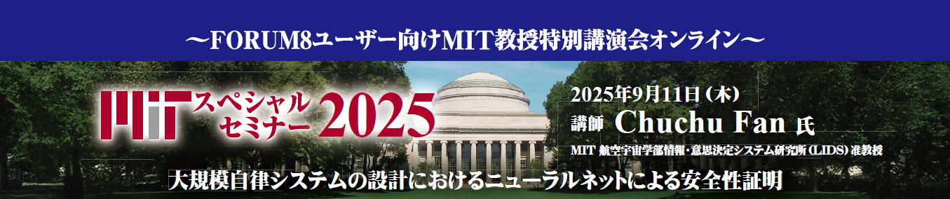フォーラムエイトは、マサチューセッツ工科大学(MIT)の産学連携プログラムにより、2021年から毎年3月と9月に「MITスペシャルセミナー」を開催しています。10回目となる今回は、航空宇宙学部、情報意思決定システム研究所(LIDS)のChuchu Fan准教授をお招きし、「大規模自律システムの設計におけるニューラルネットによる安全性証明」をテーマにご講演いただきました。講演では、同氏の研究室が注力するニューラル証明関数と「グラフ制御バリア関数(GCBF)」を用いた、大規模で複雑なロボットシステムの安全な設計と制御に焦点が当てられました。