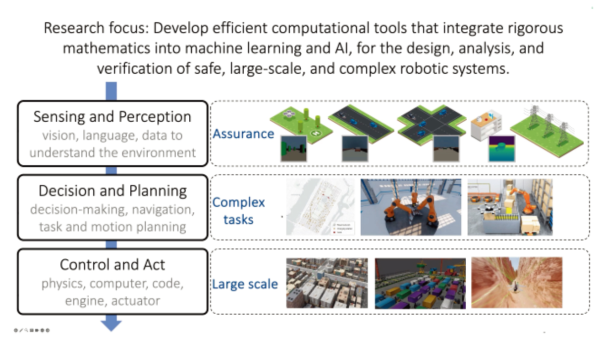 講演者の所属するLIDSは、複雑なロボットシステムを安全に設計するためのツール開発に注力しています。研究の中心は、制御の最適化と「フォーマルメソッド(形式手法)」を機械学習やAIと融合させることです。これにより、以下のような階層的な演算レベルで安全性を確保することを目指しています。