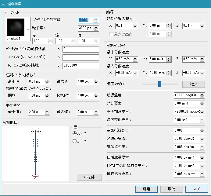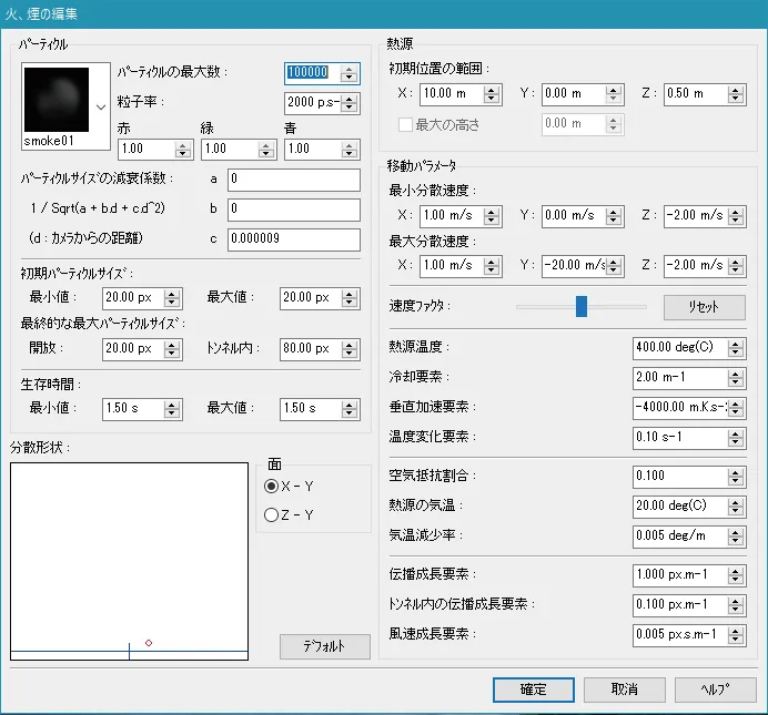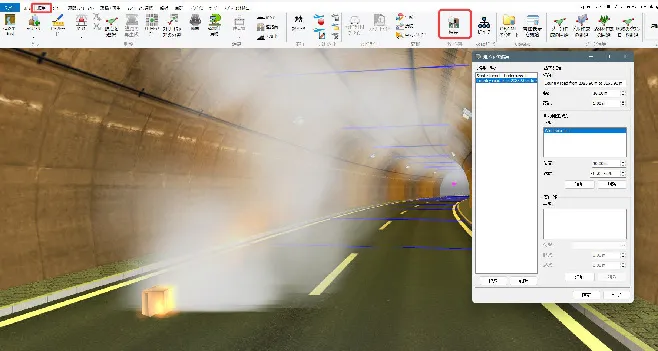 炎と煙は、デフォルトでは「描画オプション」-「気象」の風向きに従います。これをトンネルなどに沿った流れにする場合は「煙トンネル」機能を使用します。