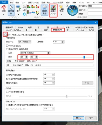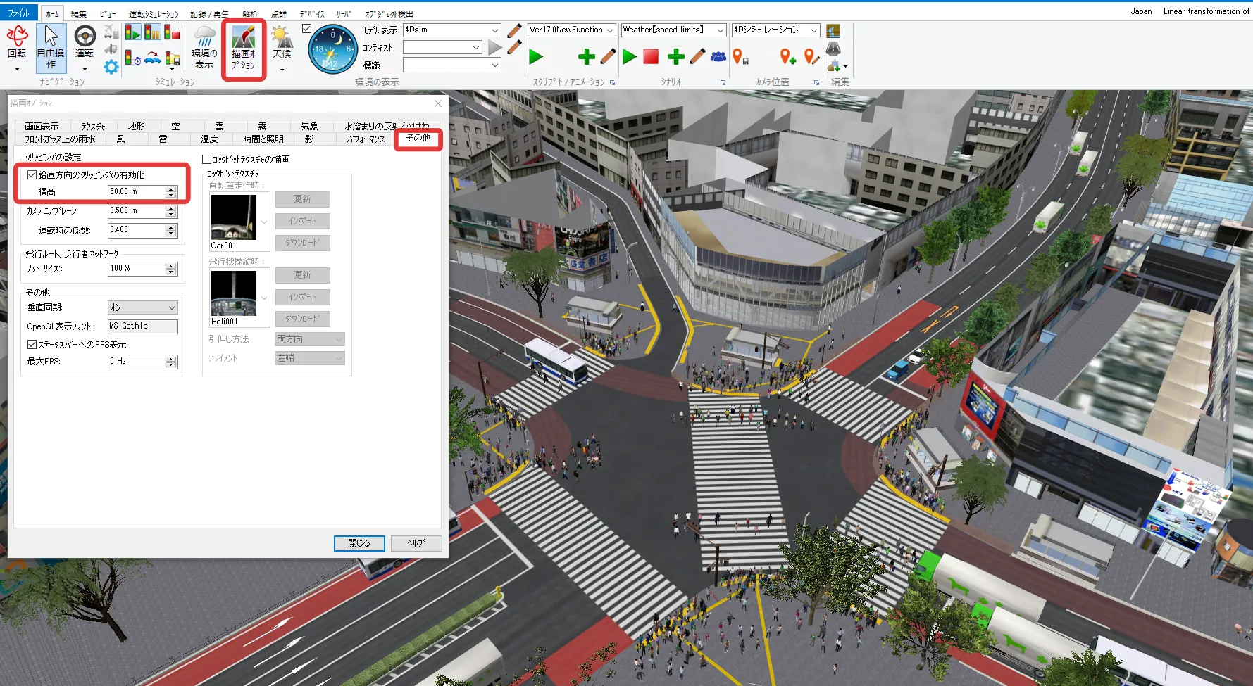 また、「描画オプション」-「画面表示」の「クリッピング」でもチェックを付けると「その他」で指定した標高でのクリッピングが有効となります。