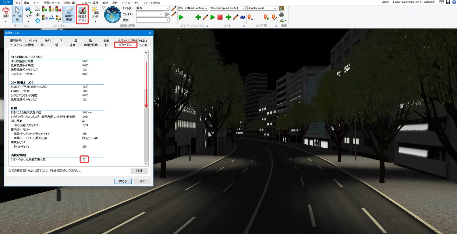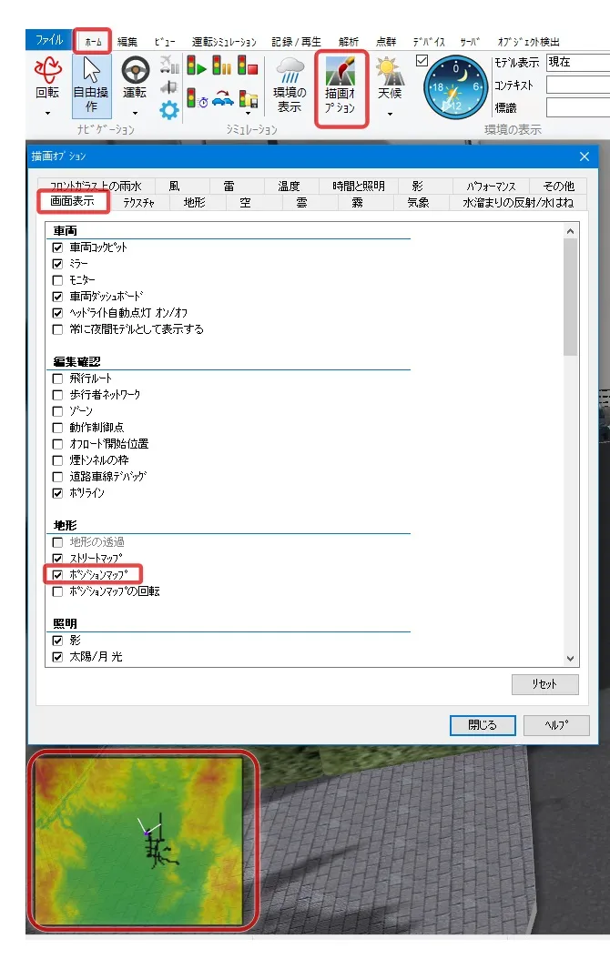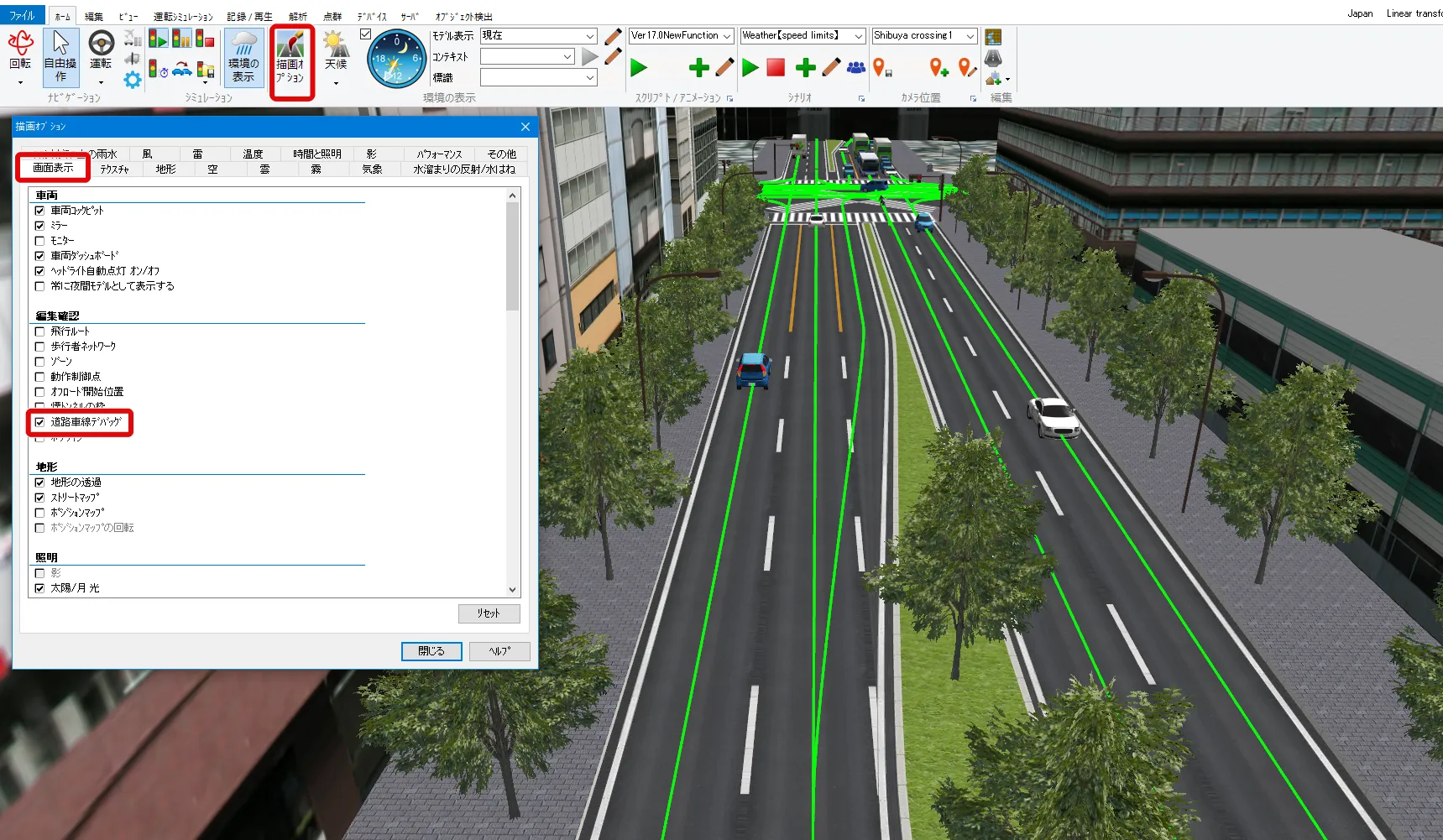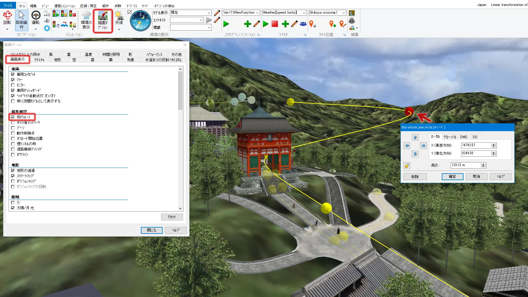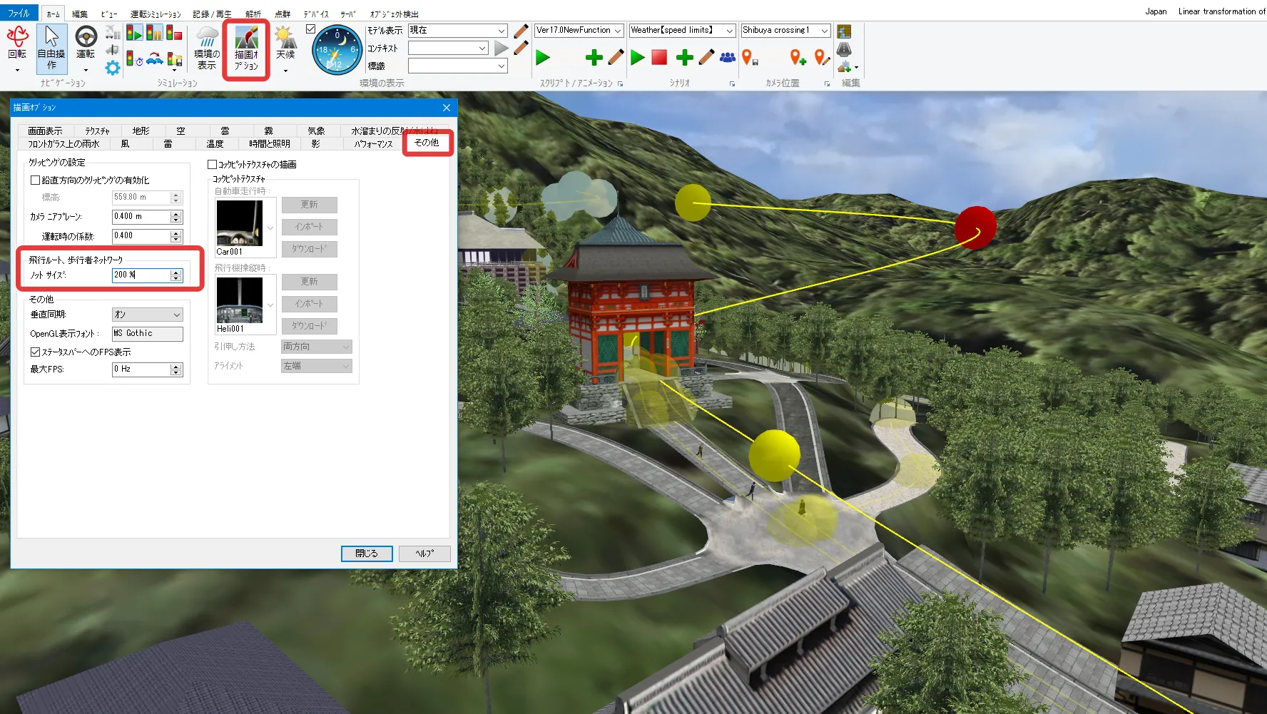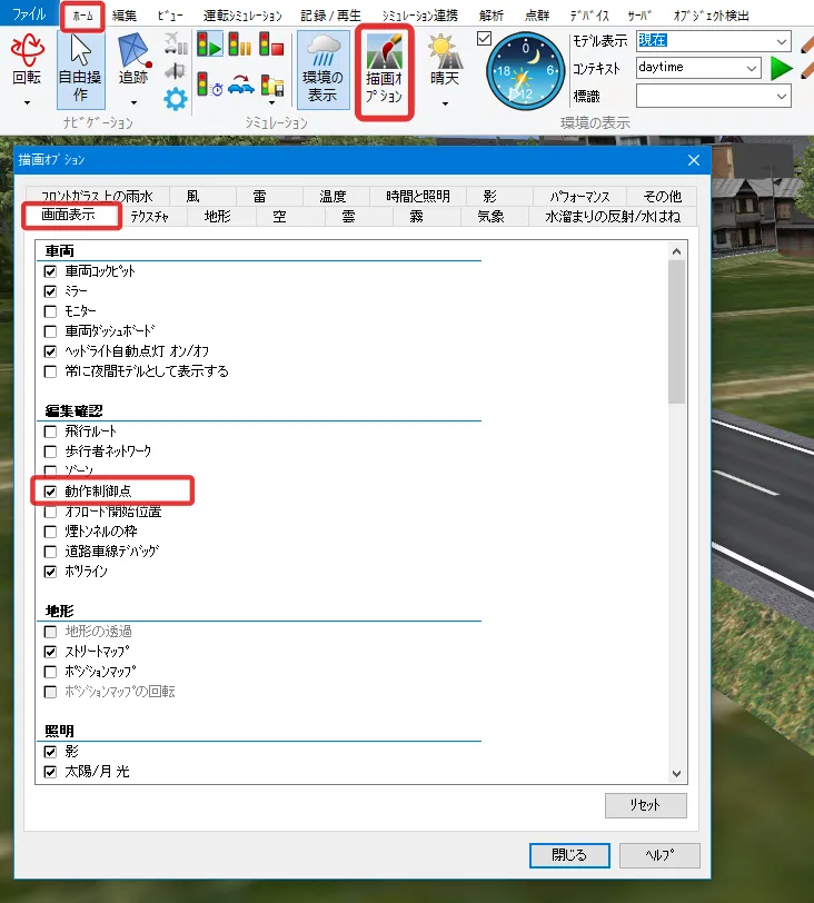 制限速度点でも速度を設定できますが、動作制御点で設定した場合は、道路平面図を開かずにメイン画面で位置や速度を調整することが可能です。メニュー「ホーム」-「描画オプション」の「画面表示」で「動作制御点」にチェックを付けるとVR空間内に緑色の球として表示されます。クリックすると編集画面が開きます。