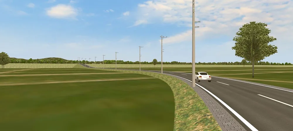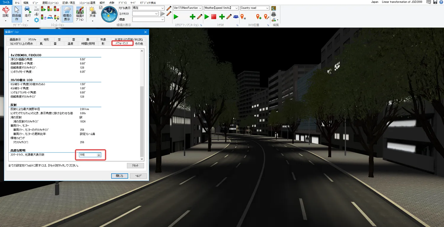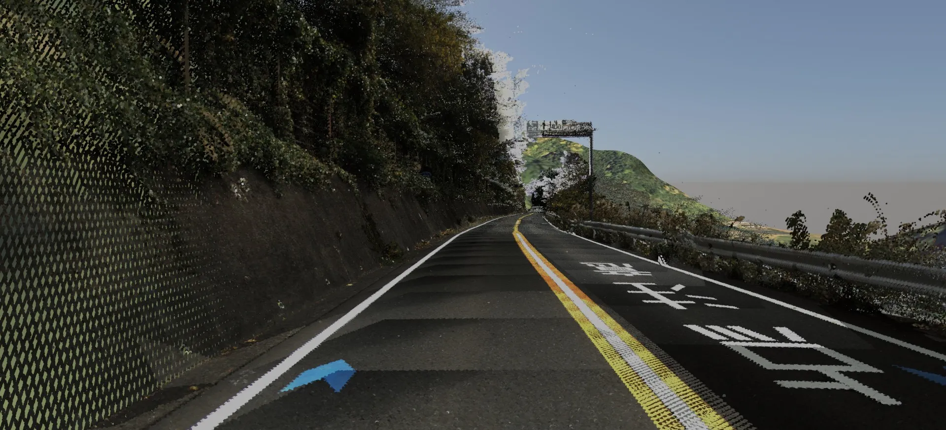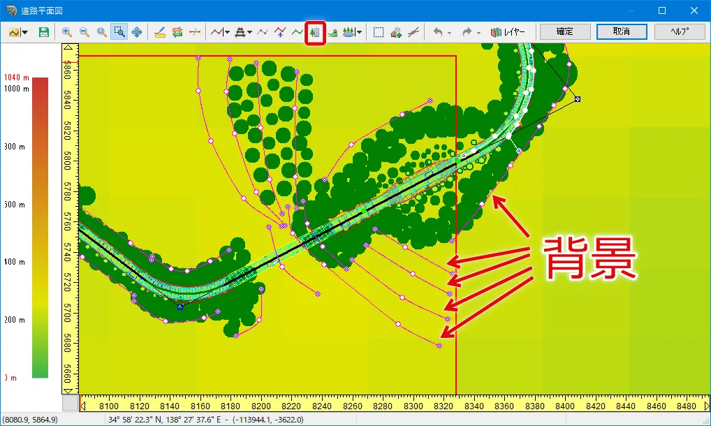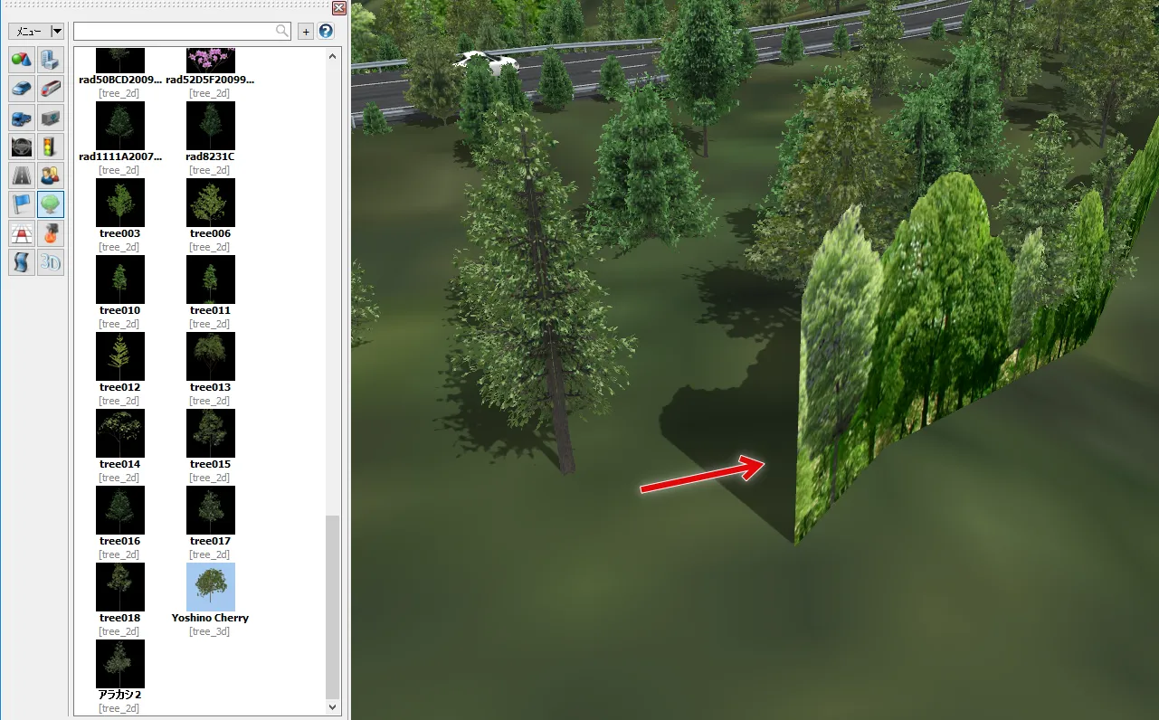 山間部の道路で周囲の森林を表現する場合、全ての樹木を道路付属物や森林生成などで配置すると樹木数が膨大になるため、「背景」で樹々を表現する方法があります。道路に近い箇所には樹木を配置し、その後ろや遠景に「背景」を設置します。
