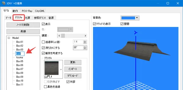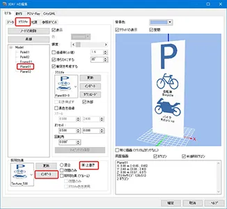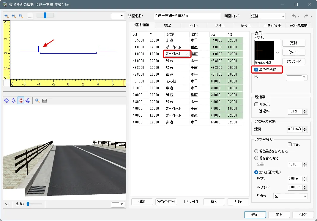 定義した面(ノード)は片面だけ表示されるため、例えばガードレールなどは左側と右側の両面を設定する必要があります。ノードの選択は、左上の断面をクリック、またはリストの行をクリックして選択します。ノードの「分類」によって右サイドの設定項目が変わります。ガードレールなどのテクスチャは黒色部分を透過させるため「黒色を透過」にチェックを付けます。