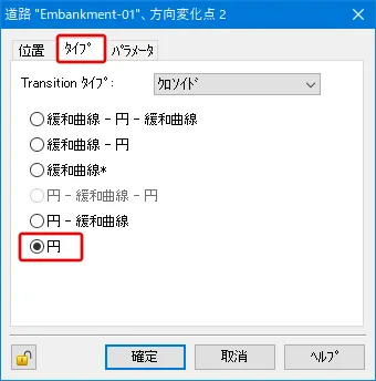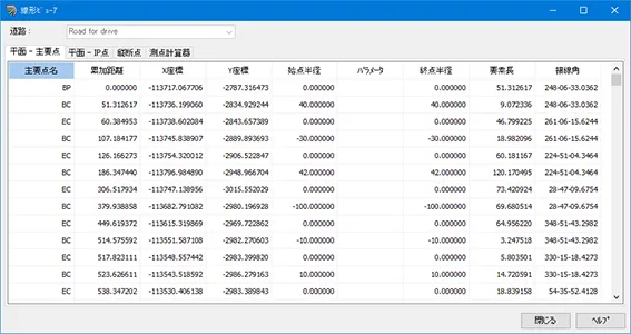 「平面-主要点」では、道路の場合BP、EP、BC、EC、KA、KEを、鉄道の場合BP、EP、BC、EC、BCC、ECC、BTC、ETC、BIT、 EIT、JTCを表示します。