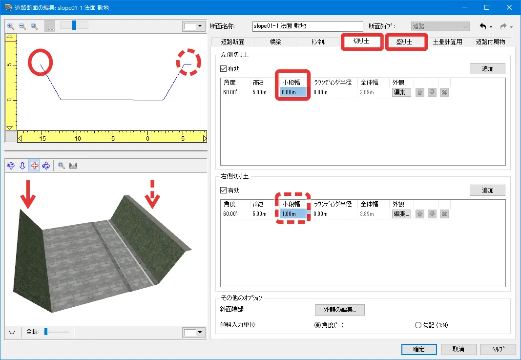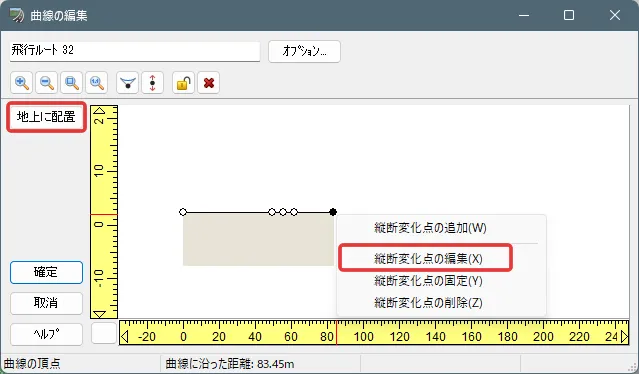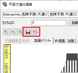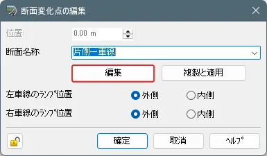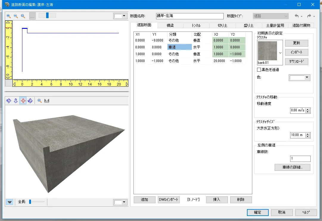 上記「道路の編集」(縦断線形)画面で「道路断面」を設定し「道路断面の編集」画面で道路の詳細を編集します。道路断面は、歩道や車道、縁石などの各部位を一筆書きの要領で定義します。
