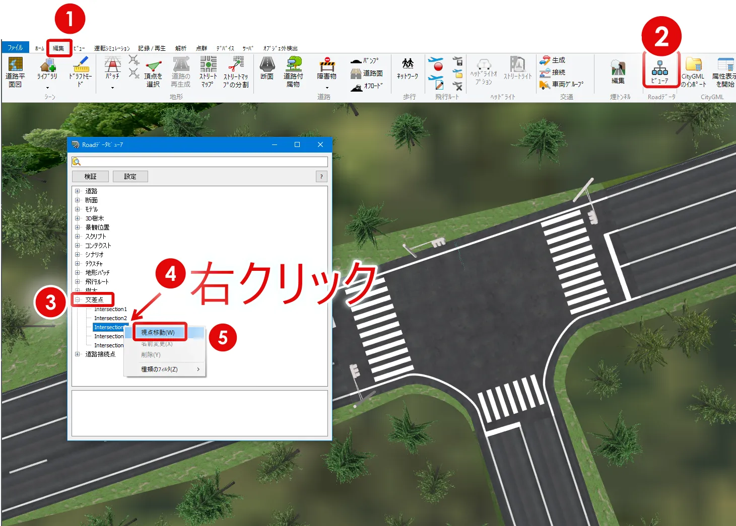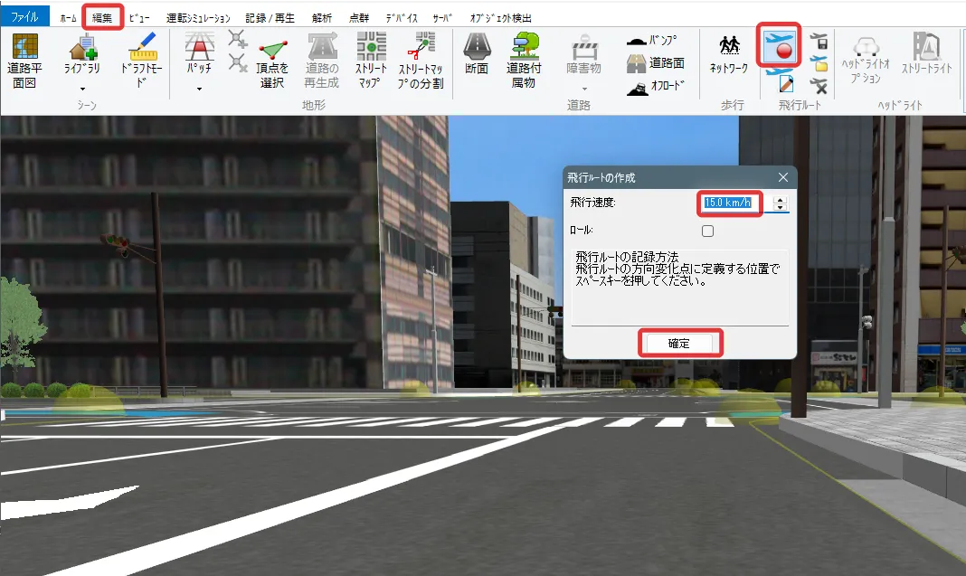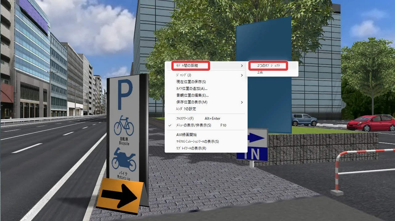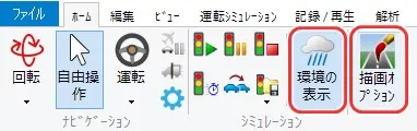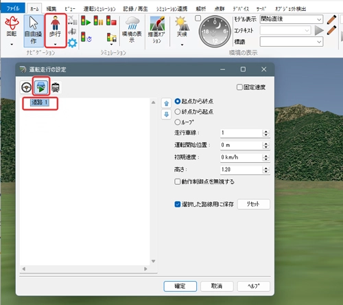 メニュー「ホーム」で「歩行」(左から2番目の「自由操作」の右側にあるボタン)をクリックして「走行」を選択します。「運転走行の設定」画面で作成した道路を選択して「確定」します。初期速度を設定した場合は走行開始します。初期速度0km/hの場合は停止した状態になります。走行開始したい場合はキーボードの矢印キー[↑]で速度が上がります。走行を停止する場合はメニュー「自由操作」ボタンをクリックします。