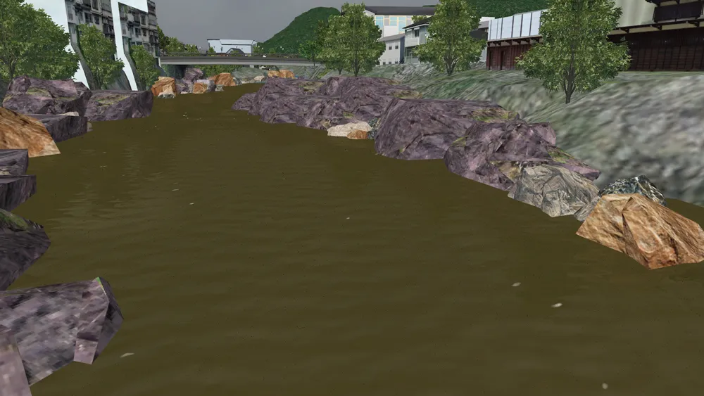 釜石市周辺をイメージしたデータです。Xpswmmによる津波の解析結果をVR上で可視化します。