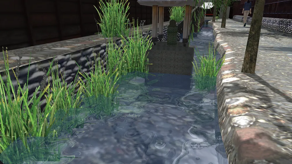 視点に近すぎたり背景の端が見えたりすると、板状であることがわかり違和感が生じるため、道路脇などには設置しないようにしたり、視点と背景の間に樹木を適宜配置したりします。