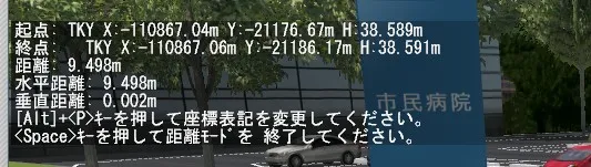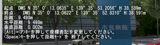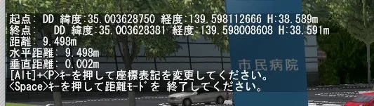 ここで、[Alt]+[P]キーを押すと、起点(第1地点)と終点(第2地点)の位置情報がローカル座標、グローバル(世界測地系座標)、日本測地系座標、緯度経度DMS、緯度経度DD、と押すたびに表記が入れ替わるため、距離だけでなく位置情報を知りたい場合にも使えます。