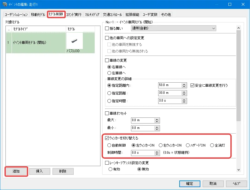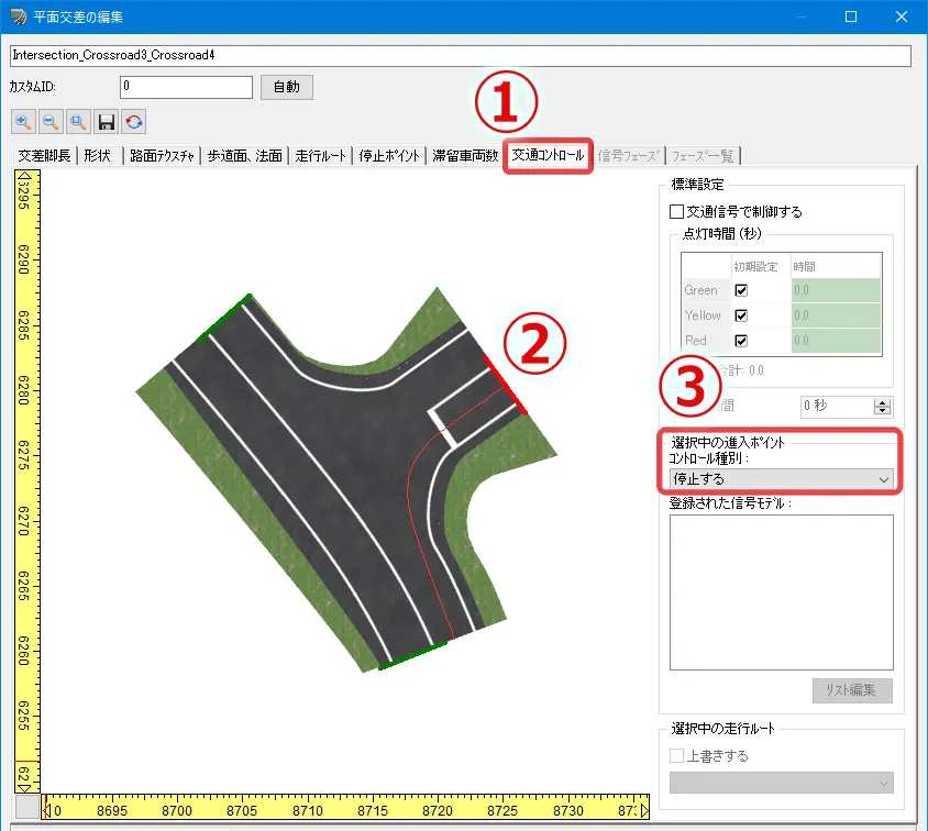 「交通コントロール」タブで左折可とする走行ルートを選択し、右側のメニューの「上書きする」にチェックを入れ、「制御しない」を選択します。選択した走行ルートのみ信号による制御から外れて、赤信号でも車が左折します。「停止する」を選択すると停止ポイントで一時停止するため、必ず一時停止させたい場合はこの方法をとります。この設定は「交通コントロール」タブで走行ルートを選択しないと設定が確認できないため、注意が必要です。