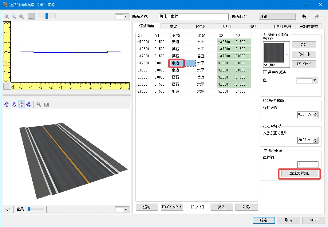 車道内の詳細な編集は、上記「道路断面の編集」画面で分類「車道」のノードを選択して「車線の詳細」で設定します。車線の幅や舗装の種類、ライン(区画線)の色や幅などを編集することができます。