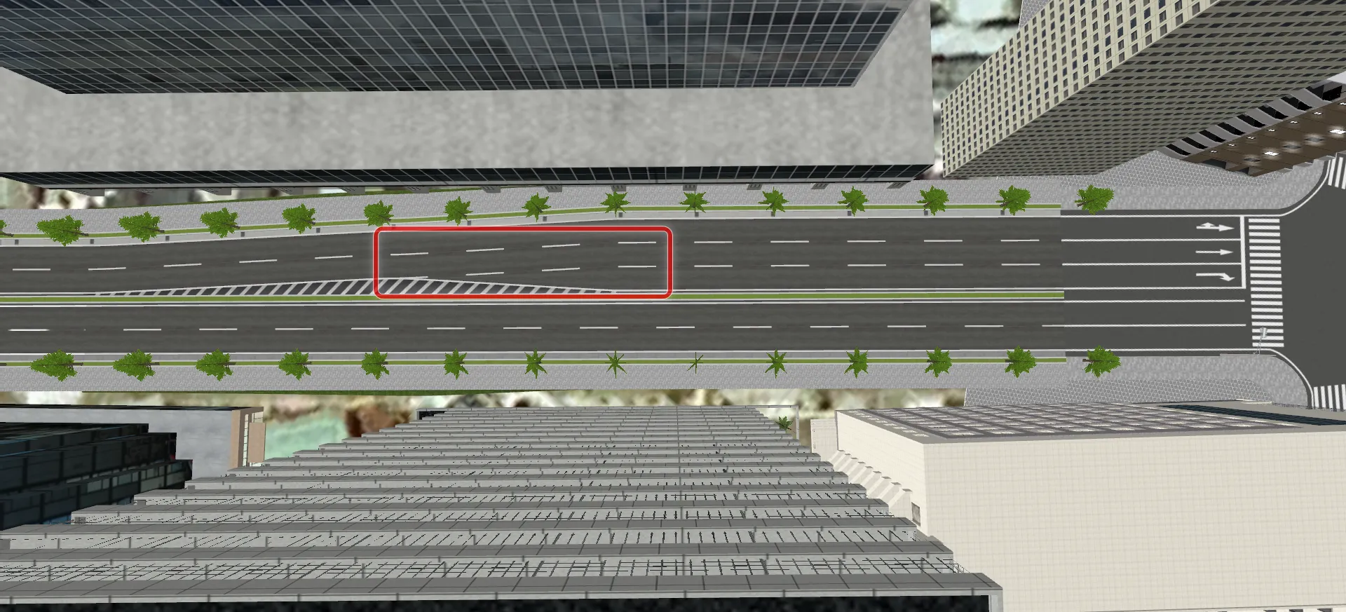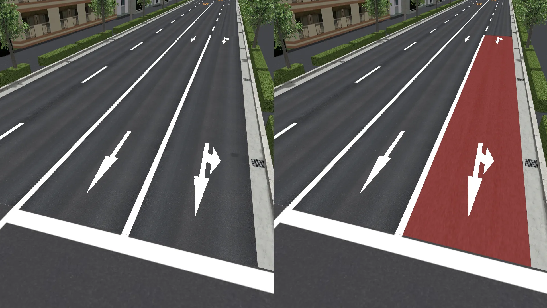 水面やゼブラ、敷地モデルなどで、近くで見ると綺麗だけど上空から見るとちらつくという場合があります。元の地面や道路面と上に配置したモデルとの高さが近い場合に発生します。高さの差を大きくすればちらつきが軽減されますが、近くで見る場合は高さが近いほうが自然に見えます。