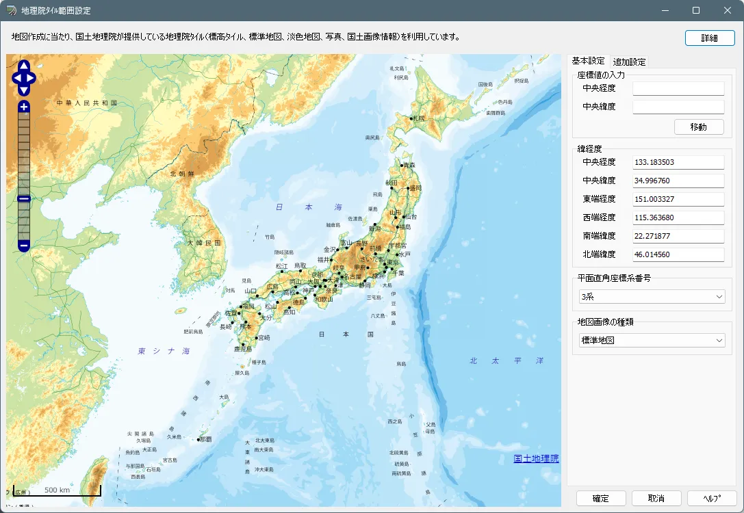 メニュー「ファイル」-「新規プロジェクト」-「地理院タイルの読み込み」で「地理院タイル範囲設定」画面を開きます。