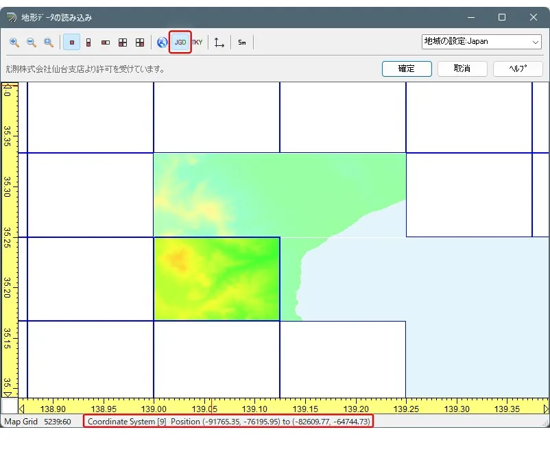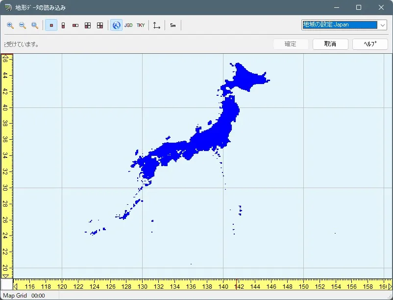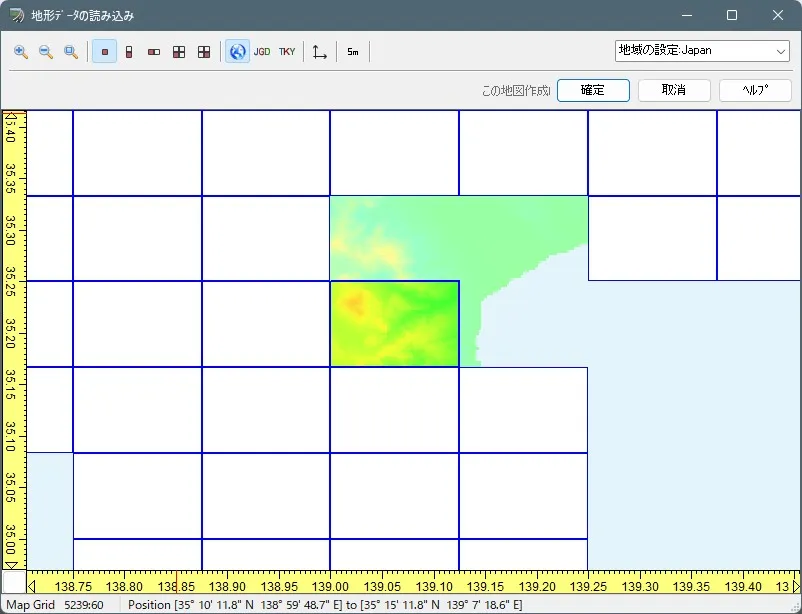 メニュー「ファイル」-「新規プロジェクト」-「日本」で「地形データの読み込み」画面を開きます。