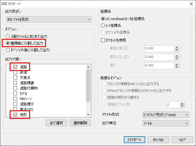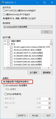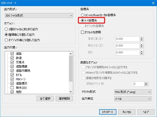まず、UC-win/Roadから出力する場合は、メニュー「ファイル」-「エクスポート」で3DSモデルやFBXモデルを選択できますが、その際、「X-Y座標系」を指定して出力します。DWGモデルをエクスポートする場合は「測量座標(平面直角座標系)」で出力します。