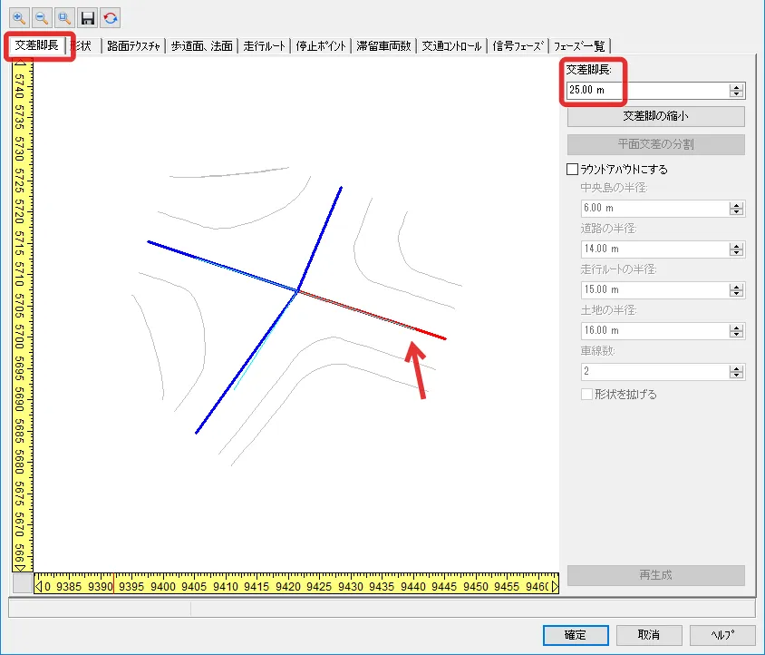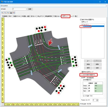 赤信号でも左折できる常時左折可の進入路を設定する方法は3種類あります。いずれも、交差点構造や信号フェーズを設定した後、「道路平面図」の交差点の編集画面で行います。