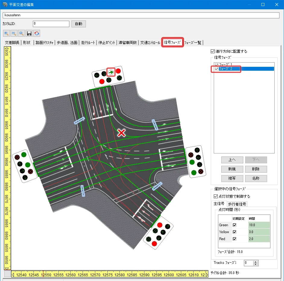 「信号フェーズ」タブで左折可の道路が赤信号となるフェーズを選択し、「点灯状態で制御する」のチェックを外します。信号機モデルはフェーズの設定通りに点灯しますが、走行ルートごとに個別に赤と青の設定を行うことができます。左折の走行ルートをクリックし、色が赤から緑に変われば設定完了です。