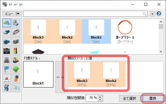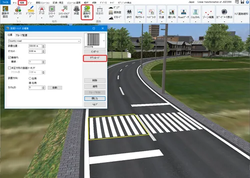 道路付属物で配置したモデル、標識、樹木、マーキングについて、後から配置物を入れ替えることが可能です。メニュー「編集」-「道路付属物」の一覧表の画面で変更したい配置物を選択して「モデルの変更」をクリックします。配置したいモデルまたは樹木等を選択して「確定」すると、入れ替わります。複数選択しての一括変更も可能です。また、配置物を選択して「編集」画面で配置物を変更することもできます。