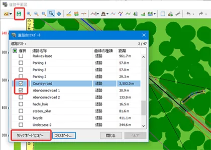メニュー「編集」-「道路付属物」の一覧表で、見出しの「▼ 道路」をクリックして「すべて選択」のチェックを外します。対象の道路のみチェックを付けて「確定」すると、指定した道路の道路付属物のみが抽出されます。