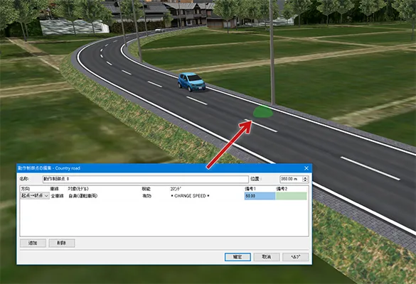 動作制御点により、道路区間毎に制限速度を設定することができます。メニュー「ホーム」または「編集」の「道路平面図」を開き、設定したい道路の平面線形上で右クリック-「追加」-「動作制御点」を指定します。「動作制御点の編集」画面でコマンド「CHANGE SPEED」を指定し、位置、方向、速度を編集することができます。動作制御点を設定すると線形上に黄緑色の点で表示されます。