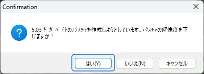「確定」すると、ストリートマップの予定サイズが表示され、許可を求められます。数ギガバイトのテクスチャ作成となると生成に時間を要するため、解像度を下げるかの確認メッセージが表示されます。高精細な航空写真を表示したい場合は「いいえ」を選択、作業中など生成時間を短縮したい場合は「はい」を選択し、段階的に下げていきます。