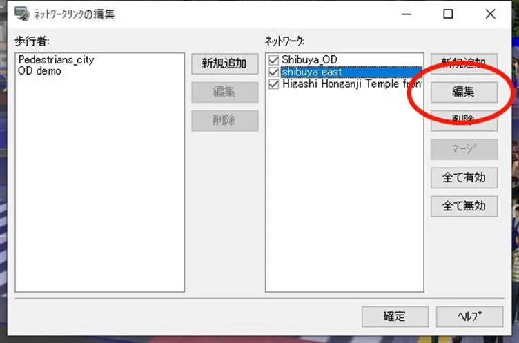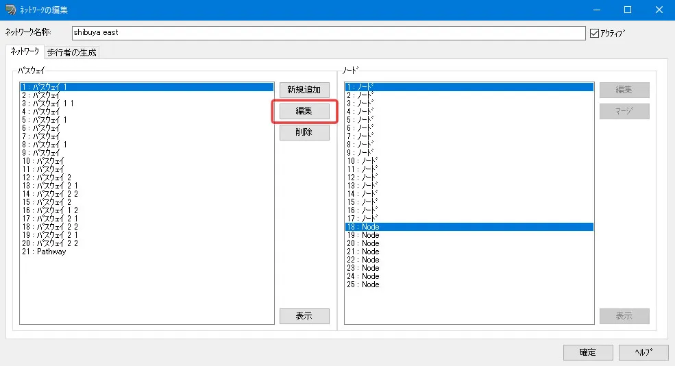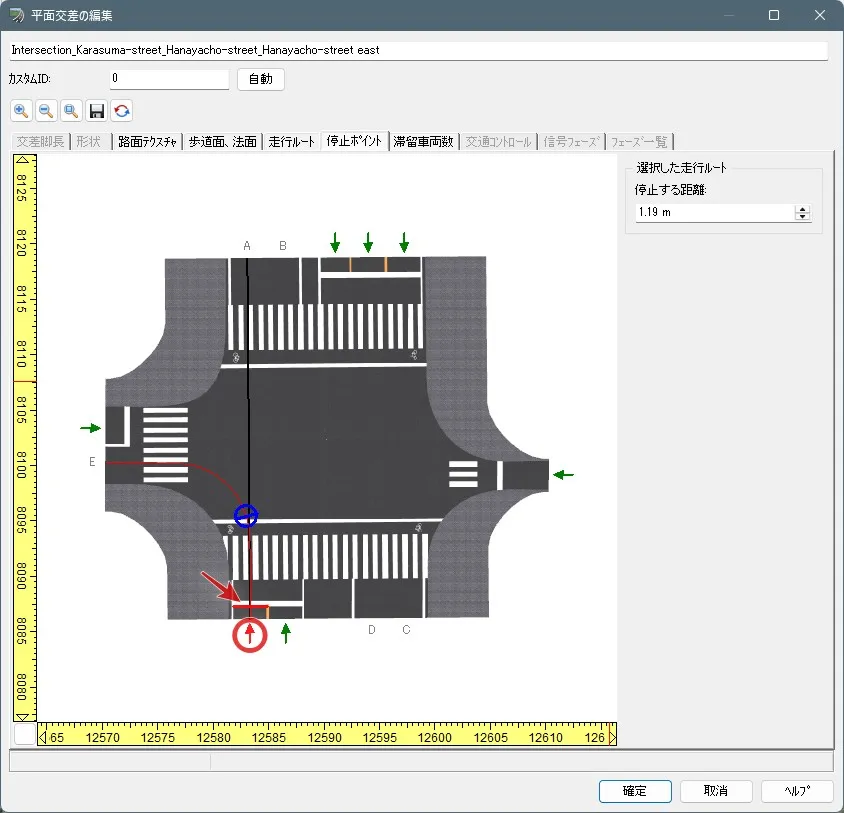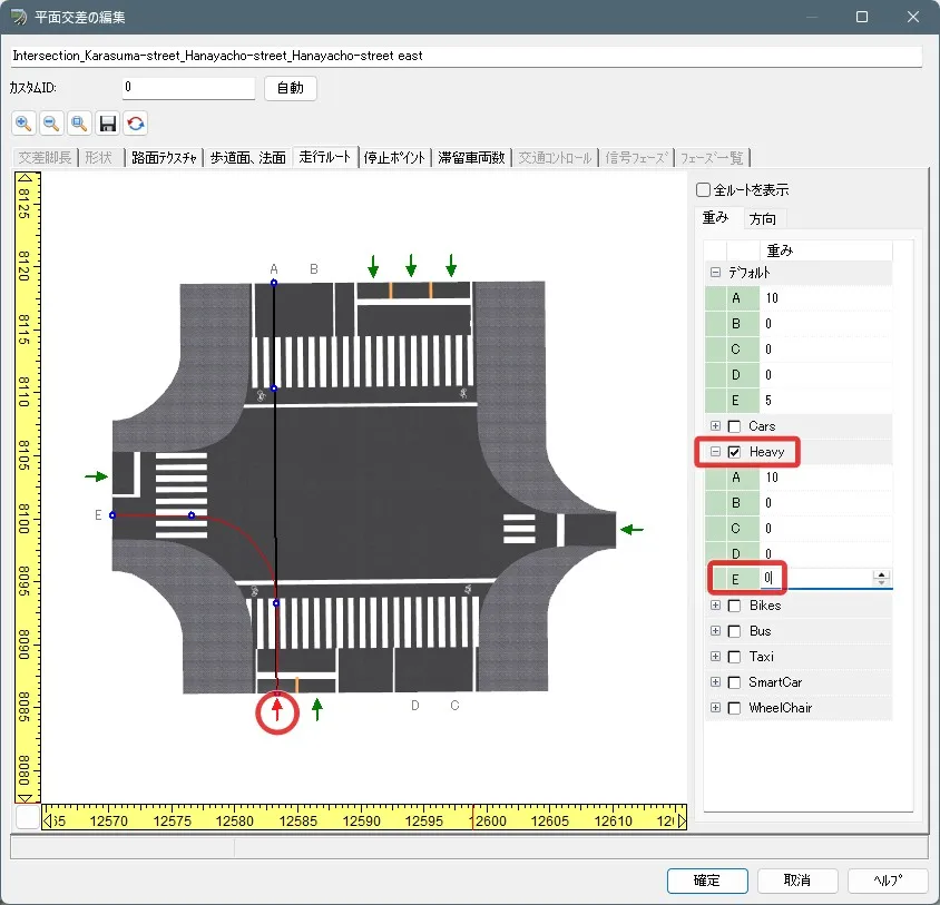 交差点編集画面の「走行ルート」を開くと新しく特定車の走行車グループが追加されているので、例えば特定車を必ず左折させたい場合は、直進のAの重みを0にして全てEに進行するようにします。