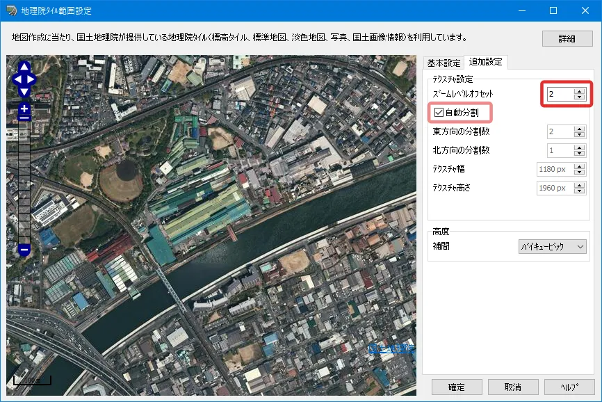 読み込んだ地形データを見て航空写真が粗い場合は、画像解像度を調整することができます。