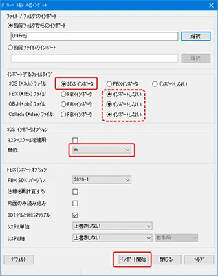 読み込むモデル形式に合わせて「インポートするファイルタイプ」を指定します。 「インポート開始」により、本来の座標位置に自動的に配置されます。