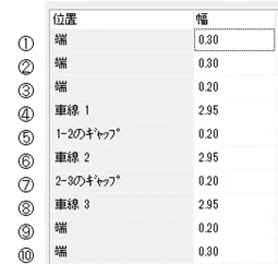 片側3車線の設定例として、各位置と車線の対応は次図のようになります。道路の端から中央に向かって1, 2, 3...となります。