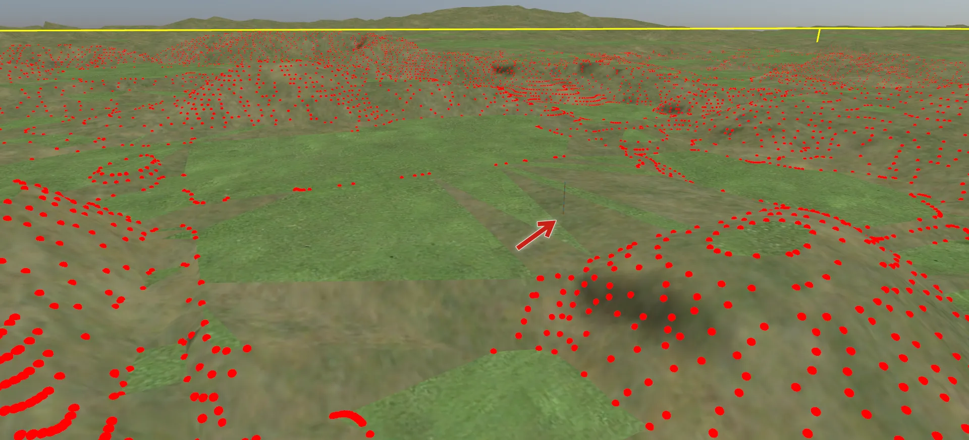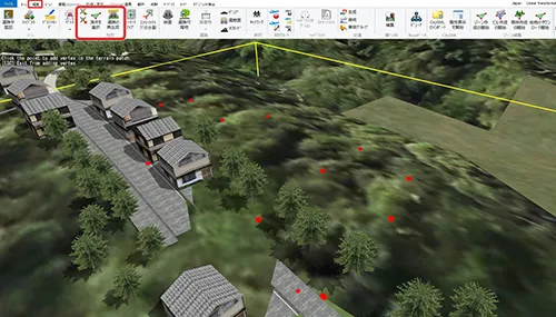 まず、不要なモデルが配置されている範囲の地形を選択します。地形の1箇所を左クリックで指定し、対角線上のもう1箇所をShiftキーを押しながらクリックします。選択された地形が黄色で表示されます。次に右クリックして「選択地形上のオブジェクトを選択」を指定すると地形上のオブジェクトが選択されます。この状態で右クリック「選択オブジェクトの削除」-「モデルを削除」すると赤枠で囲まれたモデルを一気に削除できます。