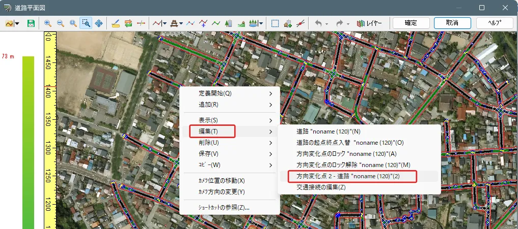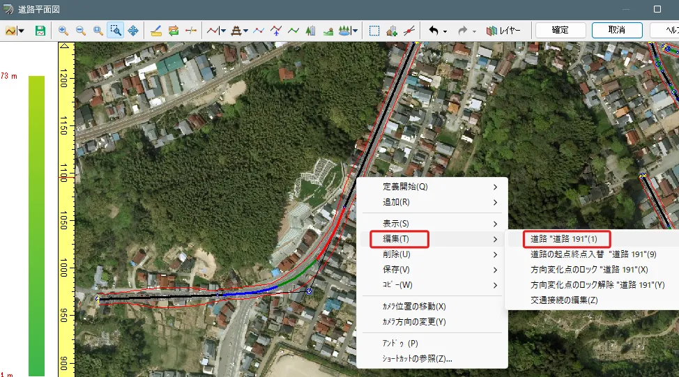 道路の平面線形に赤い×印(バツ、X)がつく場合は、方向変化点の座標と曲線パラメータの初期値との整合性が取れないために発生します。このような場合は、いったん「道路の定義を終了」後に道路線形上で右クリック「自動修正」して自動調整することができます。または、方向変化点の曲線パラメータを修正することにより対処します。