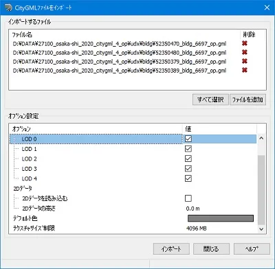 メニュー「ファイル」-「インポート」-「CityGMLの読み込み」でインポート画面が開きます。 また、メニュー「編集」-「CityGMLのインポート」でも同じインポート画面が開きます。 開いた「CityGMLファイルをインポート」画面の「ファイルを追加」で、対象範囲のCityGMLファイルを選択し、インポートすると、建物モデルが自動的に配置されます。