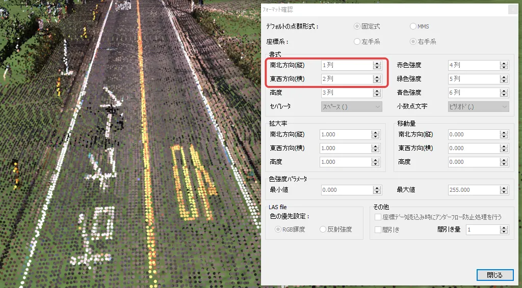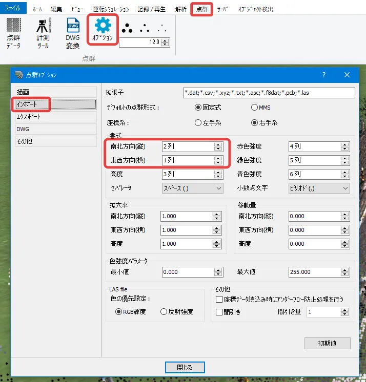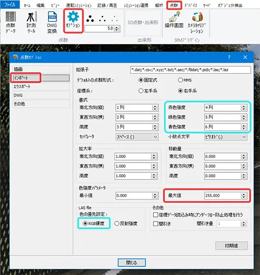 読み込んだ点群に色が表示されない場合、データの色強度情報がパラメータ設定値の範囲外になっている可能性があります。テキスト形式の点群データの場合は、メニュー「点群」-「オプション」-「インポート」のRGB情報(赤色強度/緑色強度/青色強度)の列を適切に設定します。LAS形式のデータの場合は、RGBの列の設定は不要で、「LAS file」の「色の優先設定」を「RGB輝度」にします 。