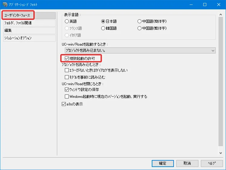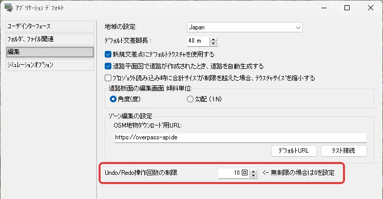 まず、航空写真のテクスチャサイズをどの程度軽くするかを自分で選択できるよう、自動で縮小する設定を解除しておきます。メニュー「ファイル」-「アプリケーションオプション」-「デフォルト設定」の「編集」で「プロジェクト読み込み時に合計サイズが制限を超えた場合、テクスチャサイズを縮小する」のチェックを外して「確定」します。