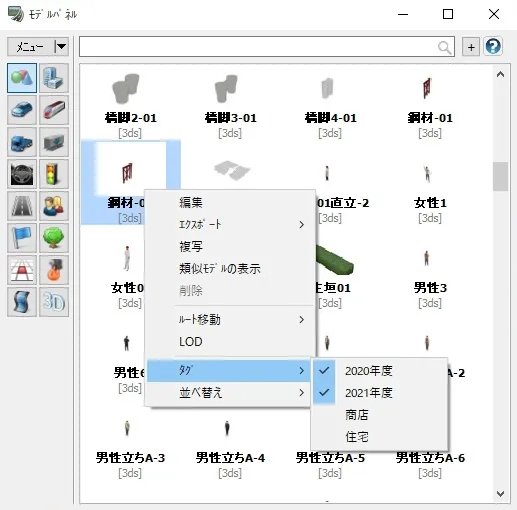 設定するには、まずタグの作成を行います。モデルパネルのメニューで「タグマネージャ」を選択し、タグの名称を入力して「+」ボタンを押すと、有効なタグとして追加されます。次に、タグを各モデルに割り当てます。割り当てるモデルのサムネイルを右クリックし、「タグ」の項目で一覧から割り当てるタグを選択します。1つのモデルに対して複数のタグを割り当てることもできます。