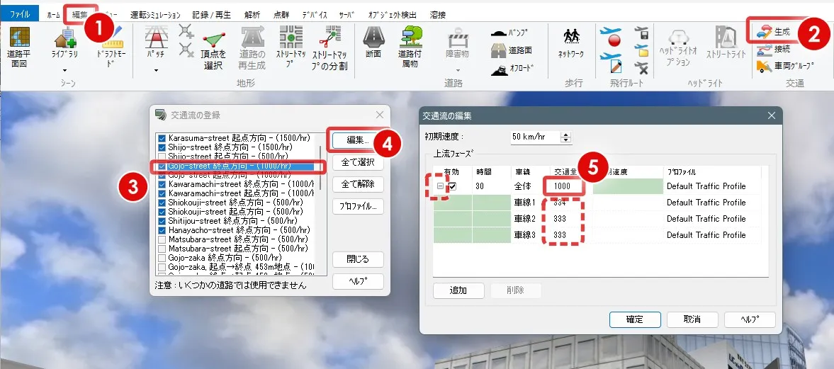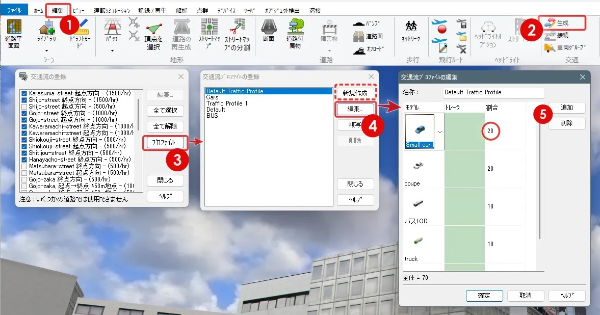 メニュー「編集」> 交通カテゴリの「車両グループ」で走行車グループを新規追加します。