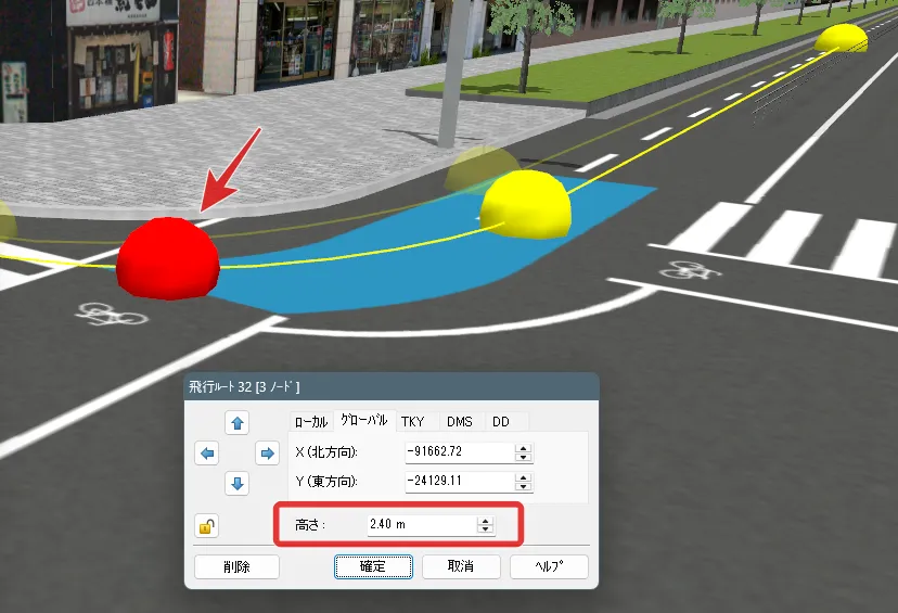 道路の終点方向に向かって左端から右側へ順に定義します。Xが道路幅でYが高さになります。原点(X1=0.0, Y1=0.0)が道路線形の位置に配置されます。