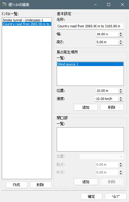 煙トンネルの基本設定ができたので、次に「風の発生場所」を作成します。煙の位置に対する相対距離と速度を設定します。速度をマイナスにするとトンネル内を道路の終点から起点に向かう流れとなります。風の発生場所はマゼンタ色で表示されます。