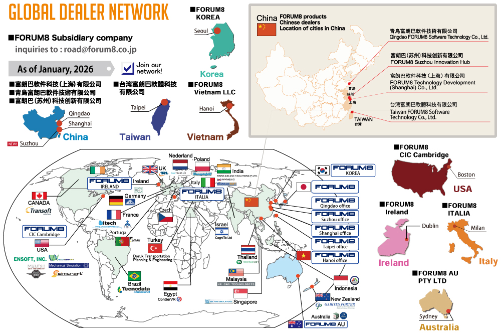 日英仏中韓伊の6カ国語対応。UC-win/Roadをはじめ、中国向け製品や英語圏向けの製品も増加しています。また、世界のディーラ(販売店網)を拡張、構築しています。中国・蘇州やイタリア・ローマ、アメリカ・ボストンなど拠点を拡大。今後も国外におけるサポートをより一層充実させていく予定です。
