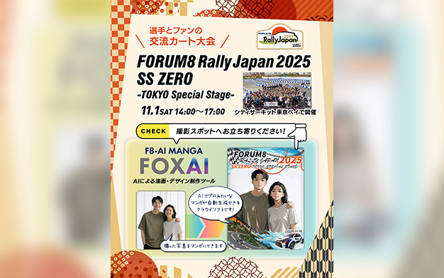 👀✨【FORUM8 Rally Japan 2025 SS ZERO -TOKYO Special Stage-】を掲載。11月1日(土)シティサーキット東京ベイでスペシャルなプレイベントが開催✨注目はFORUM8 AI MANGA「FOX AI」体験。AIが創り出す”マンガの世界”をお楽しみいただけます。