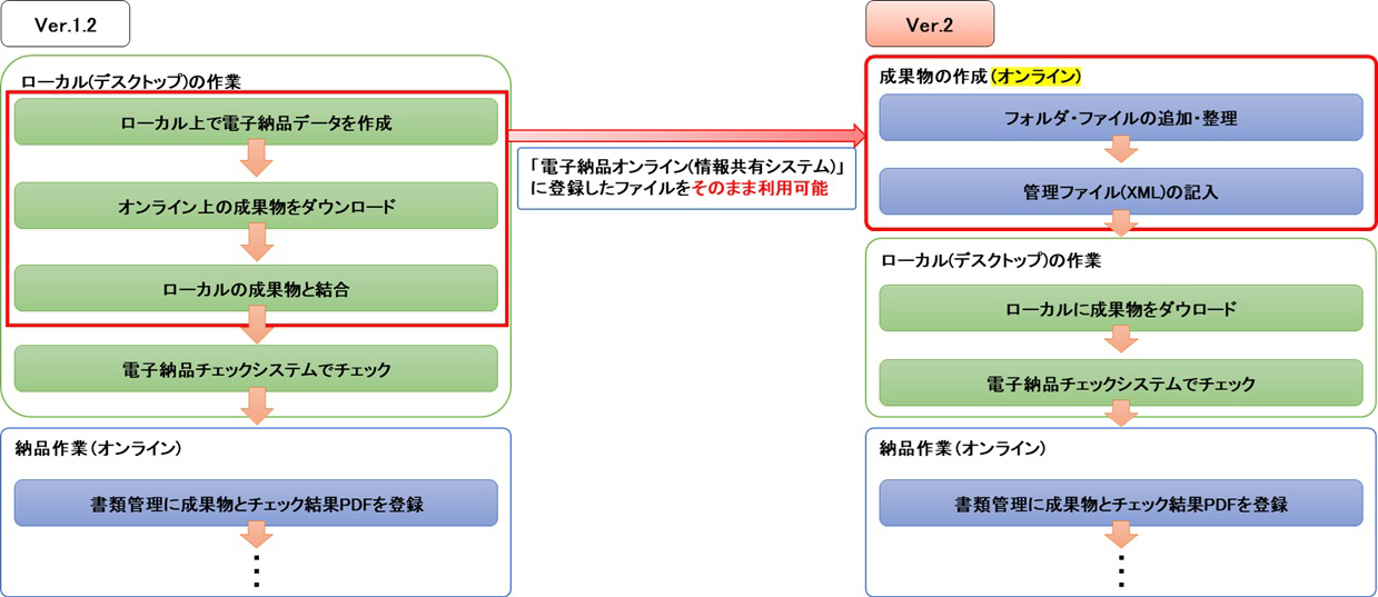 オンライン電子納品までの流れの中で、ローカル上で「電子納品支援ツール」を使用する作業を、「電子納品オンライン(情報共有システム)」上で行えるようになりました。これにより、ローカルの作業を削減することができます。
