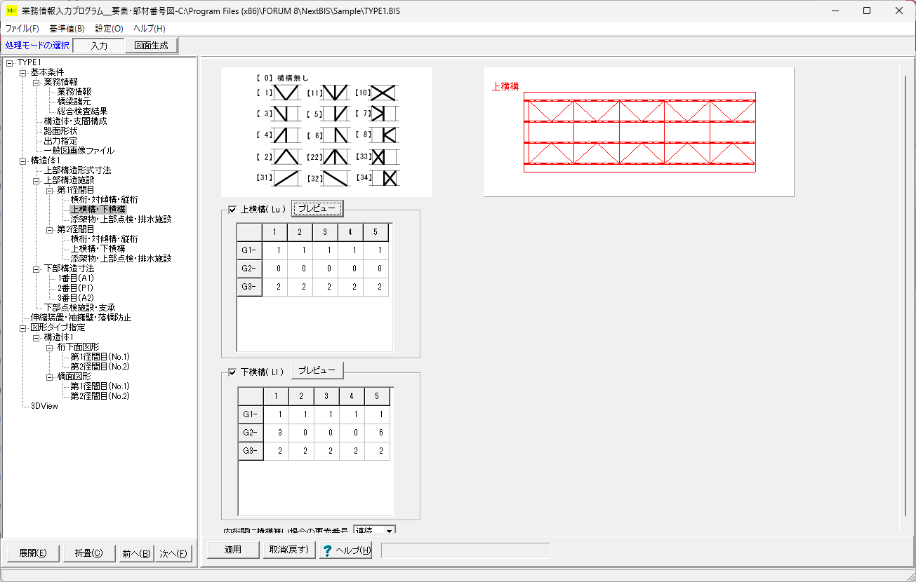 1. 対話形式により橋梁形式や形状寸法の入力を行い、径間毎の要素・部材番号図を自動作画します。